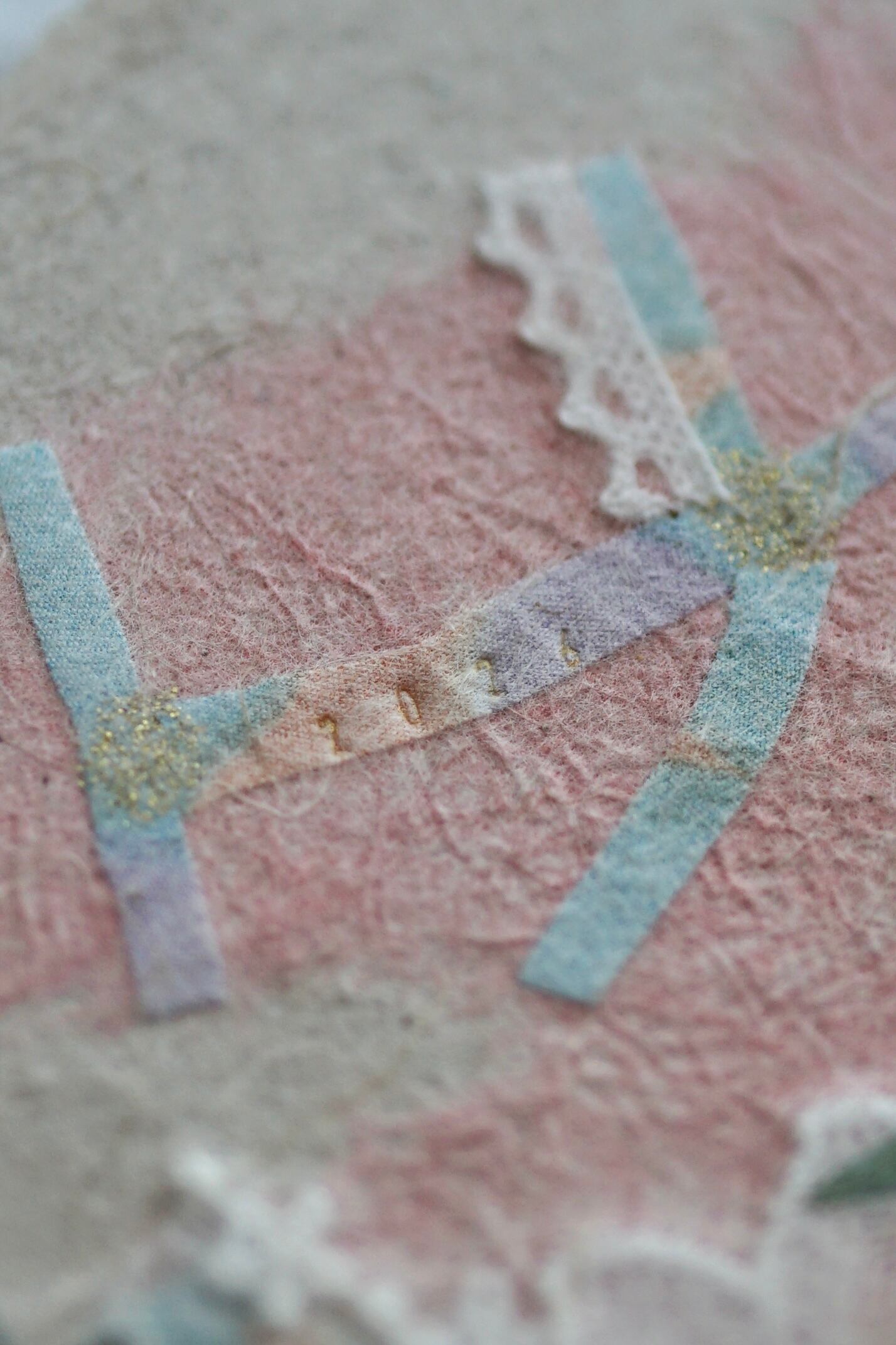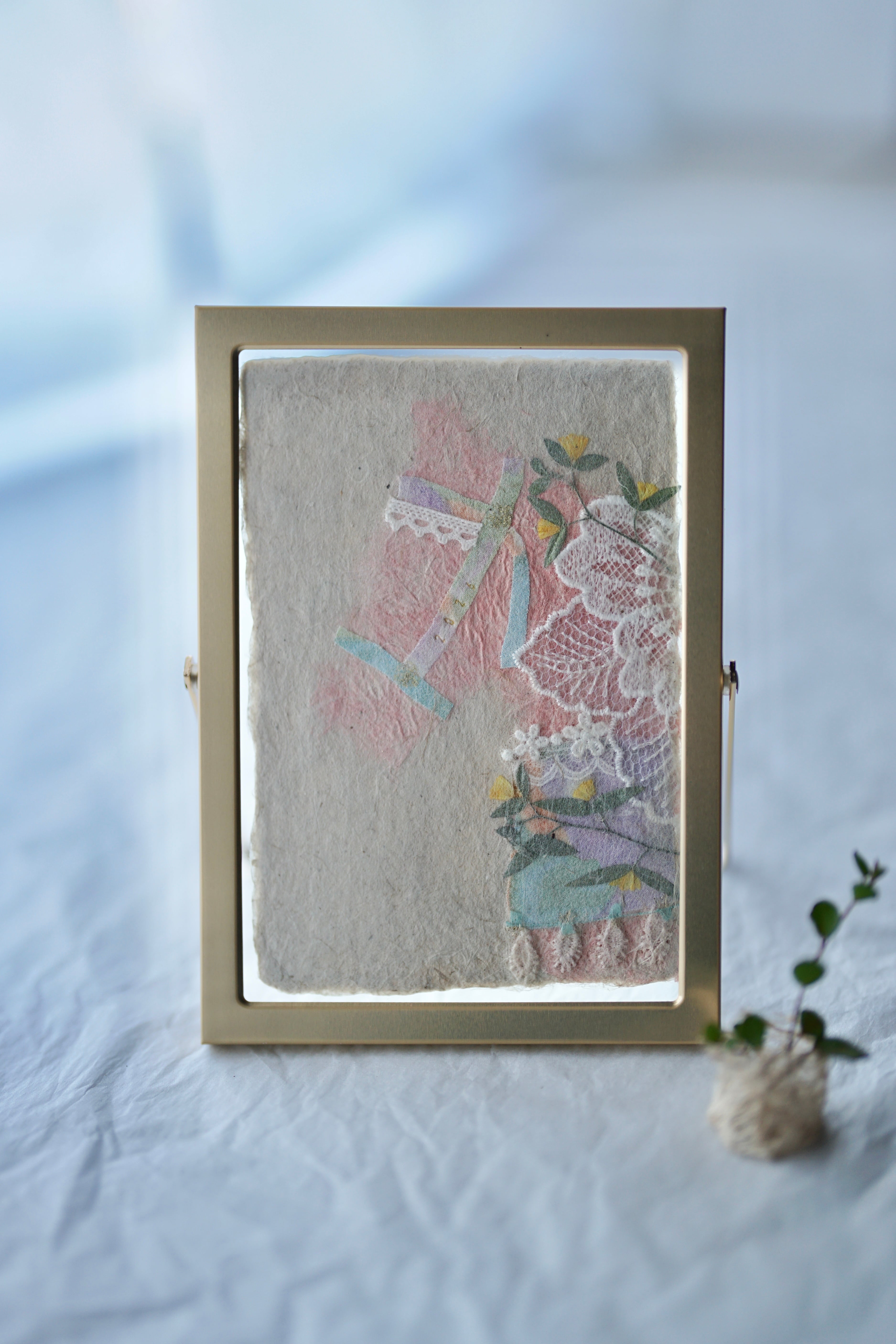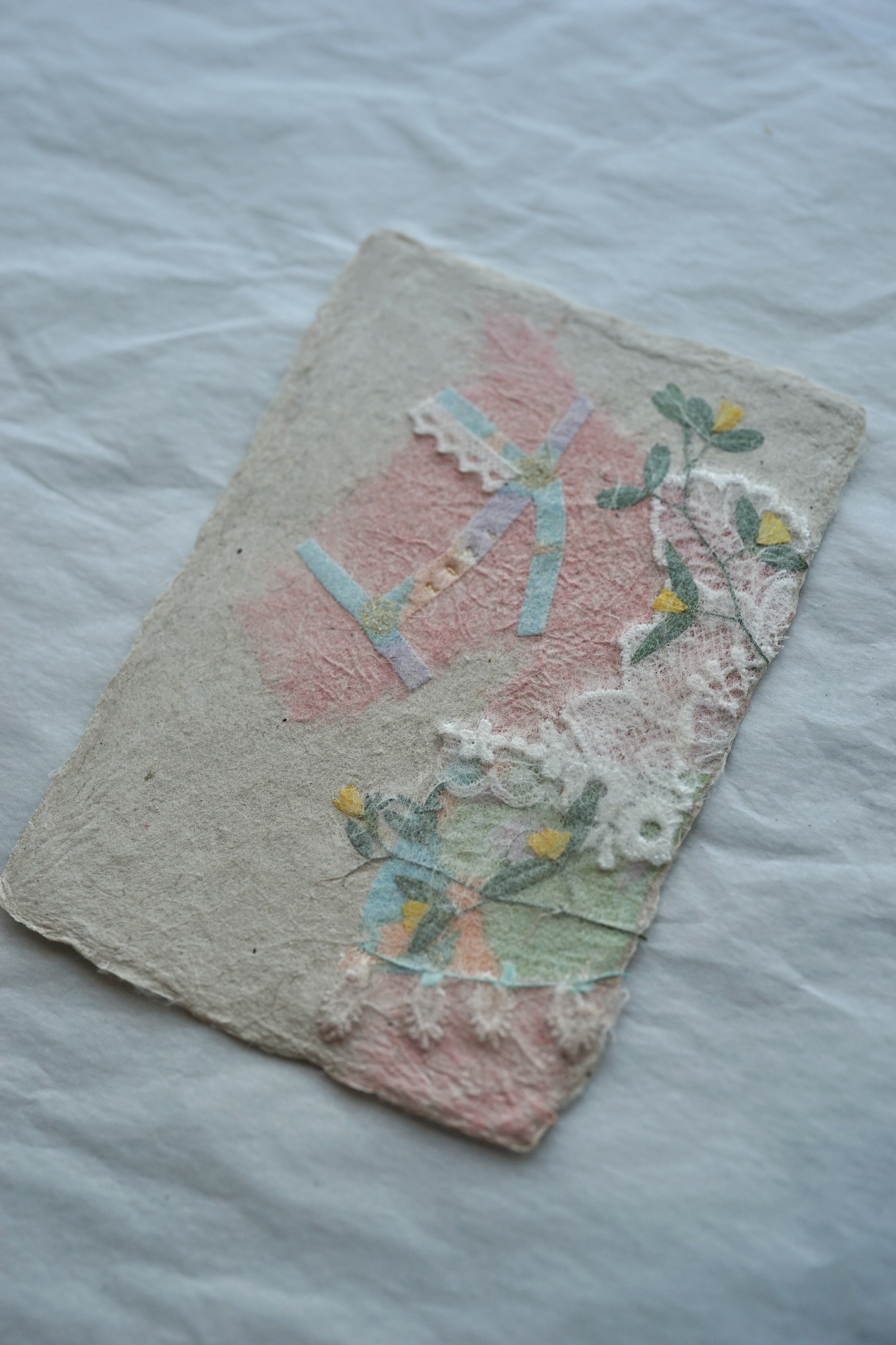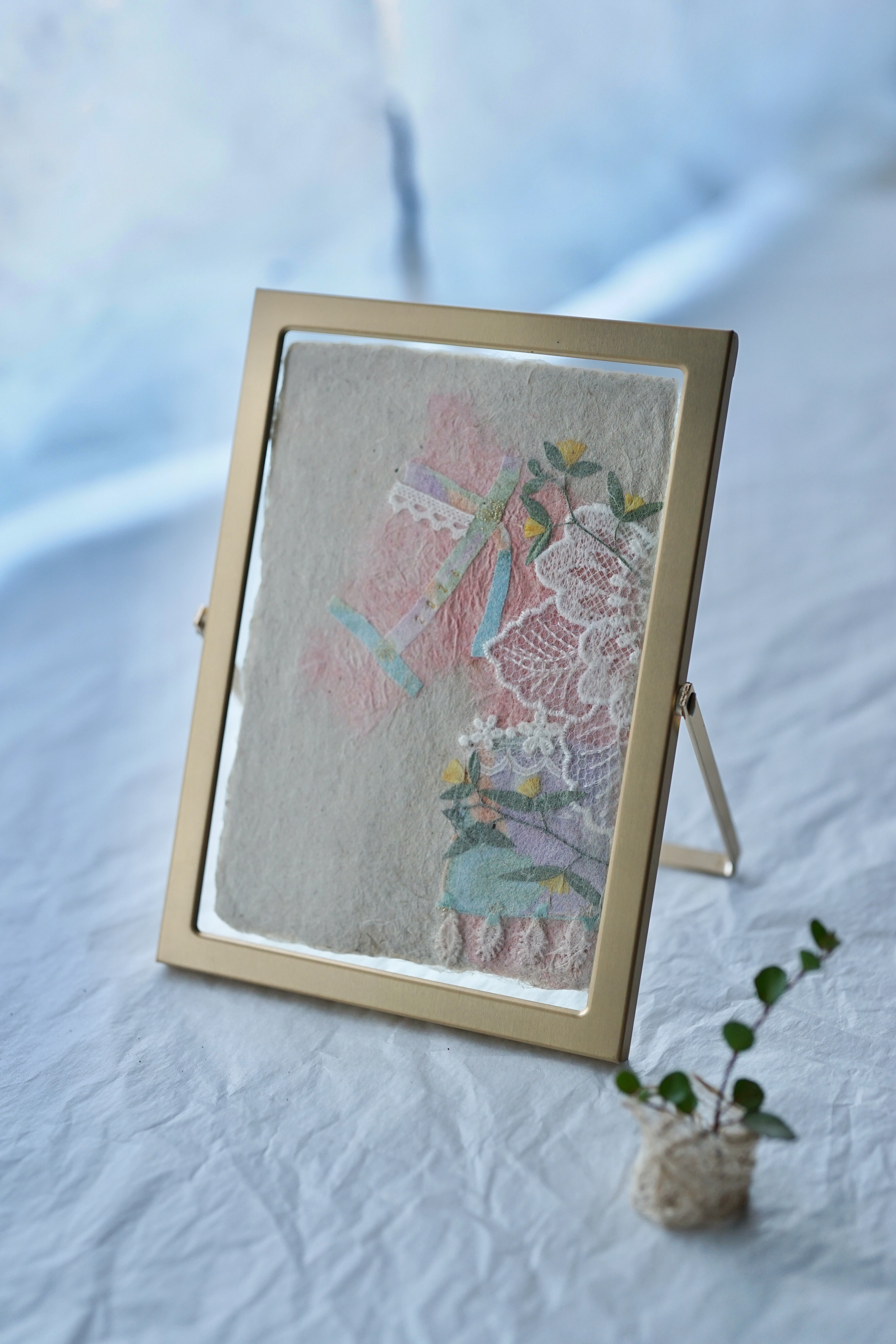 本物の布や植物を手漉き和紙の技法で漉き込んでいる為、ぽこぽことした手触りや立体感もお楽しみいただけます