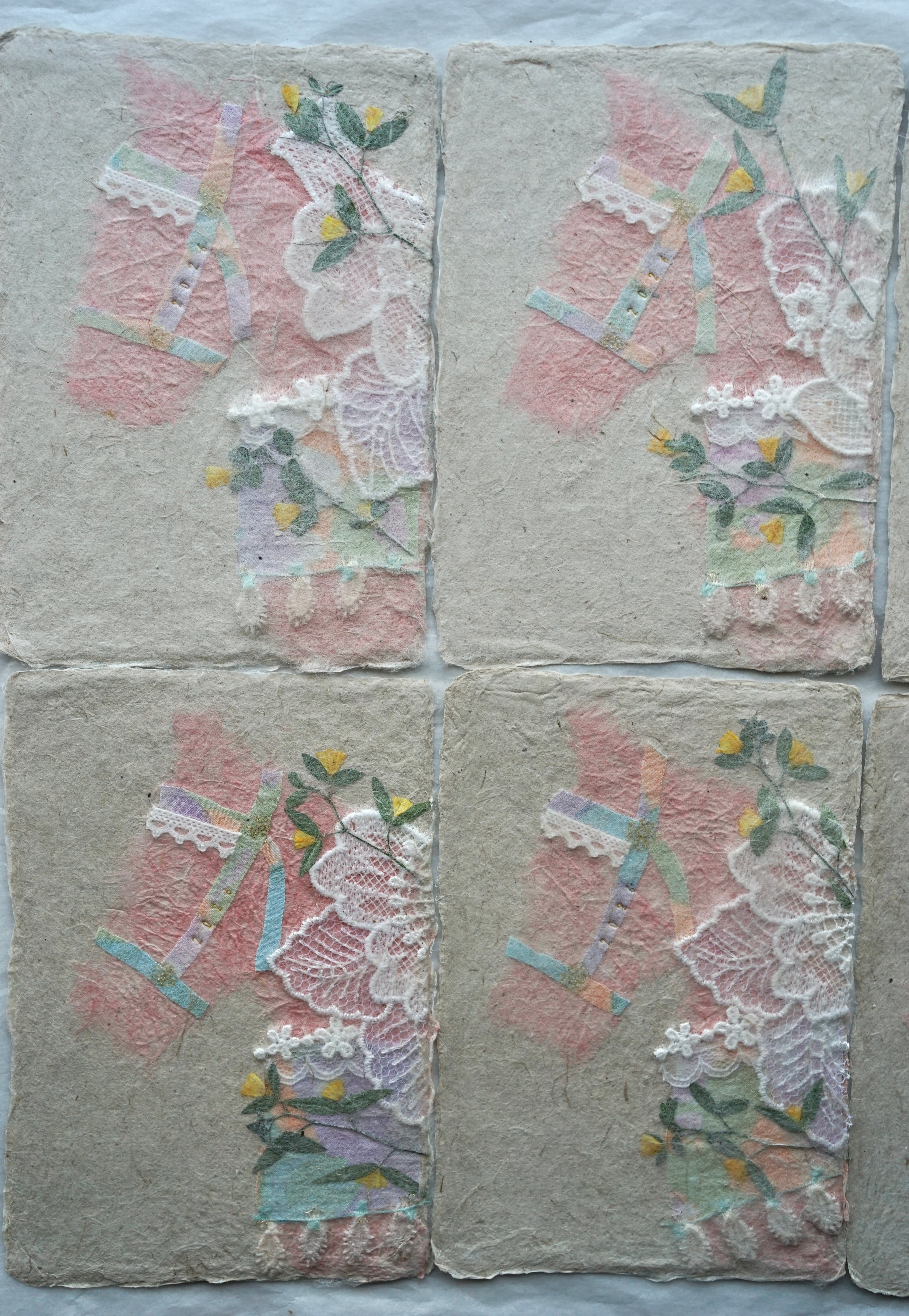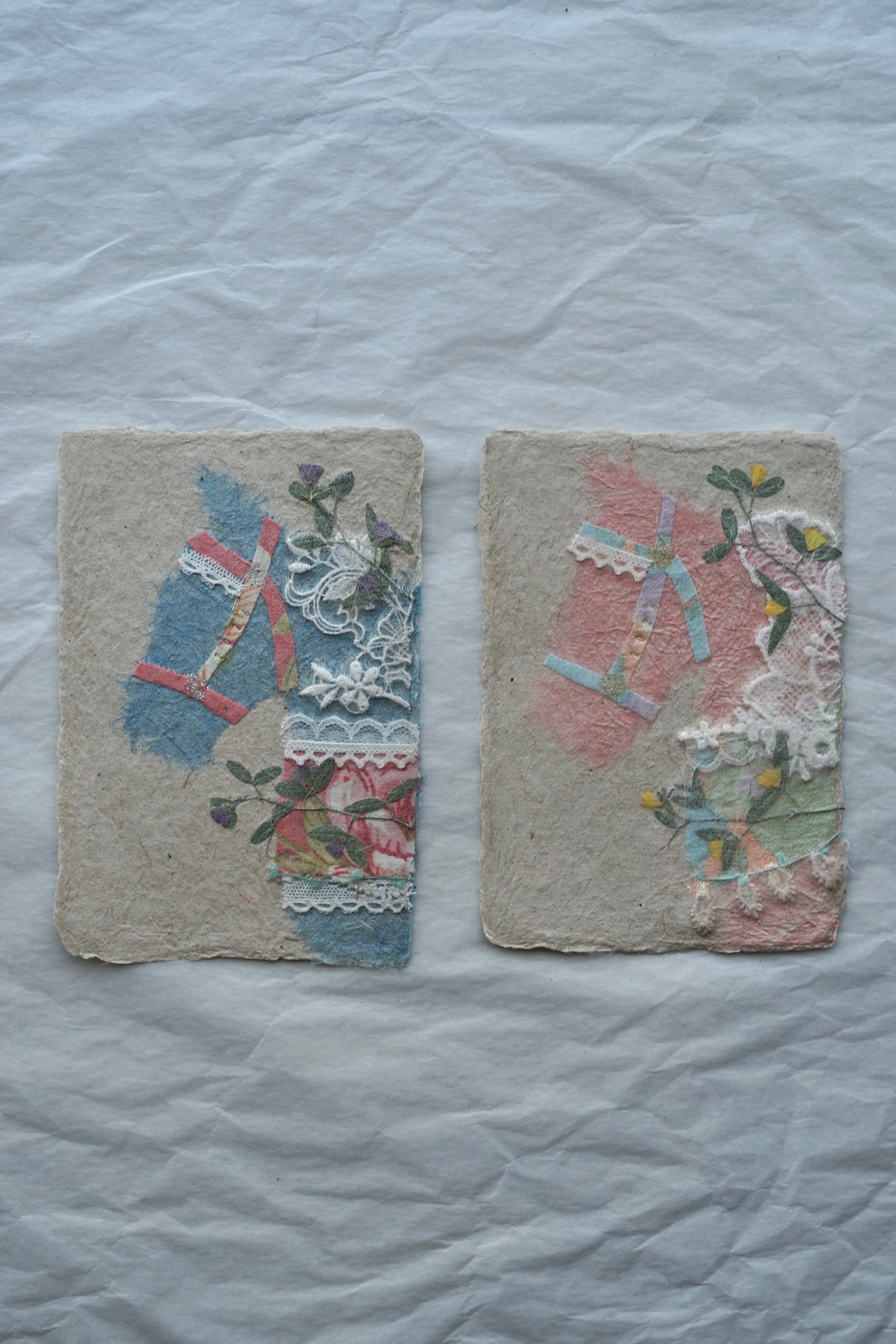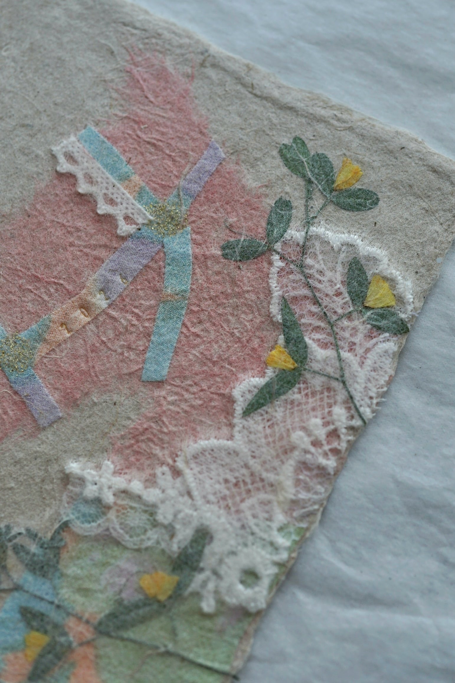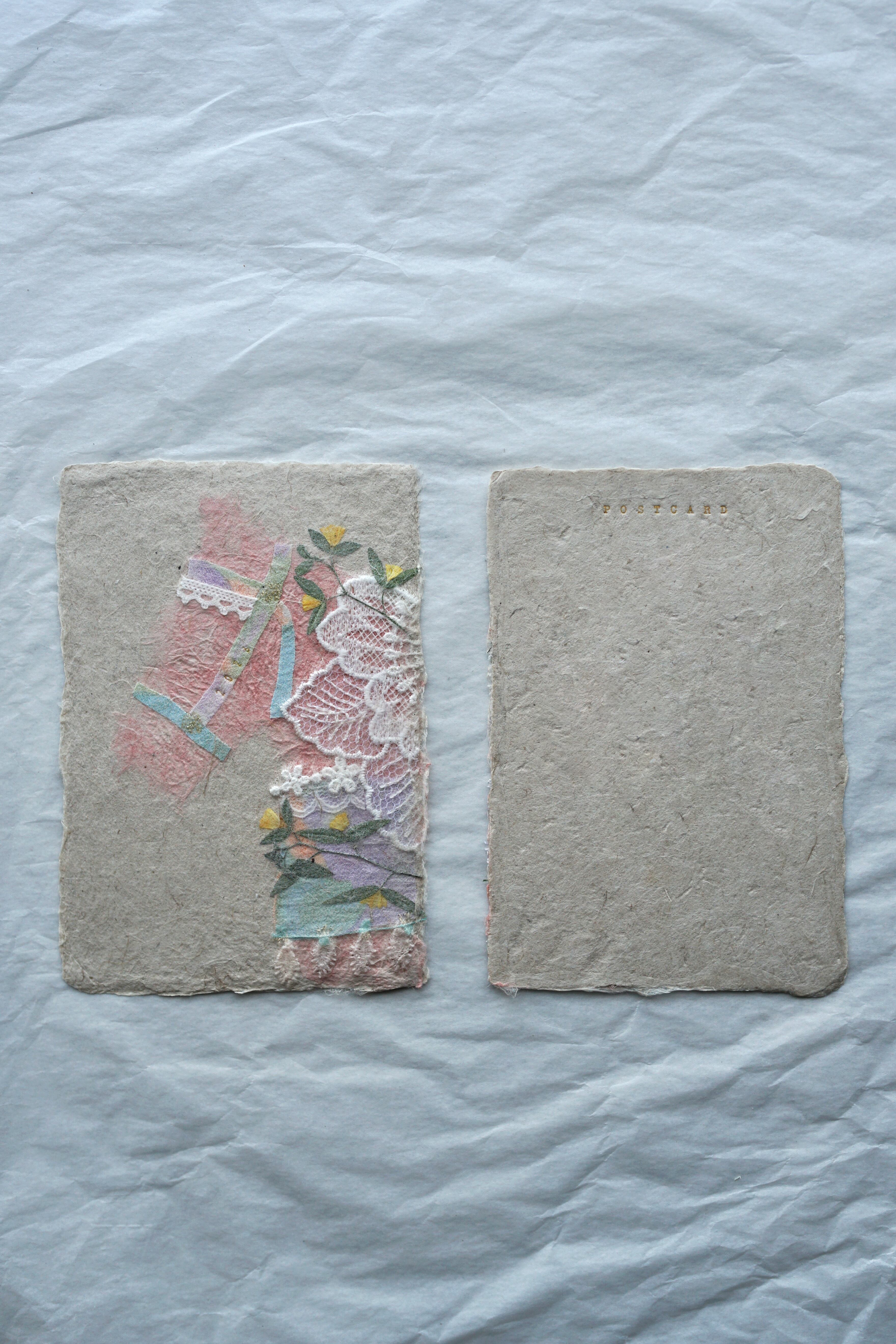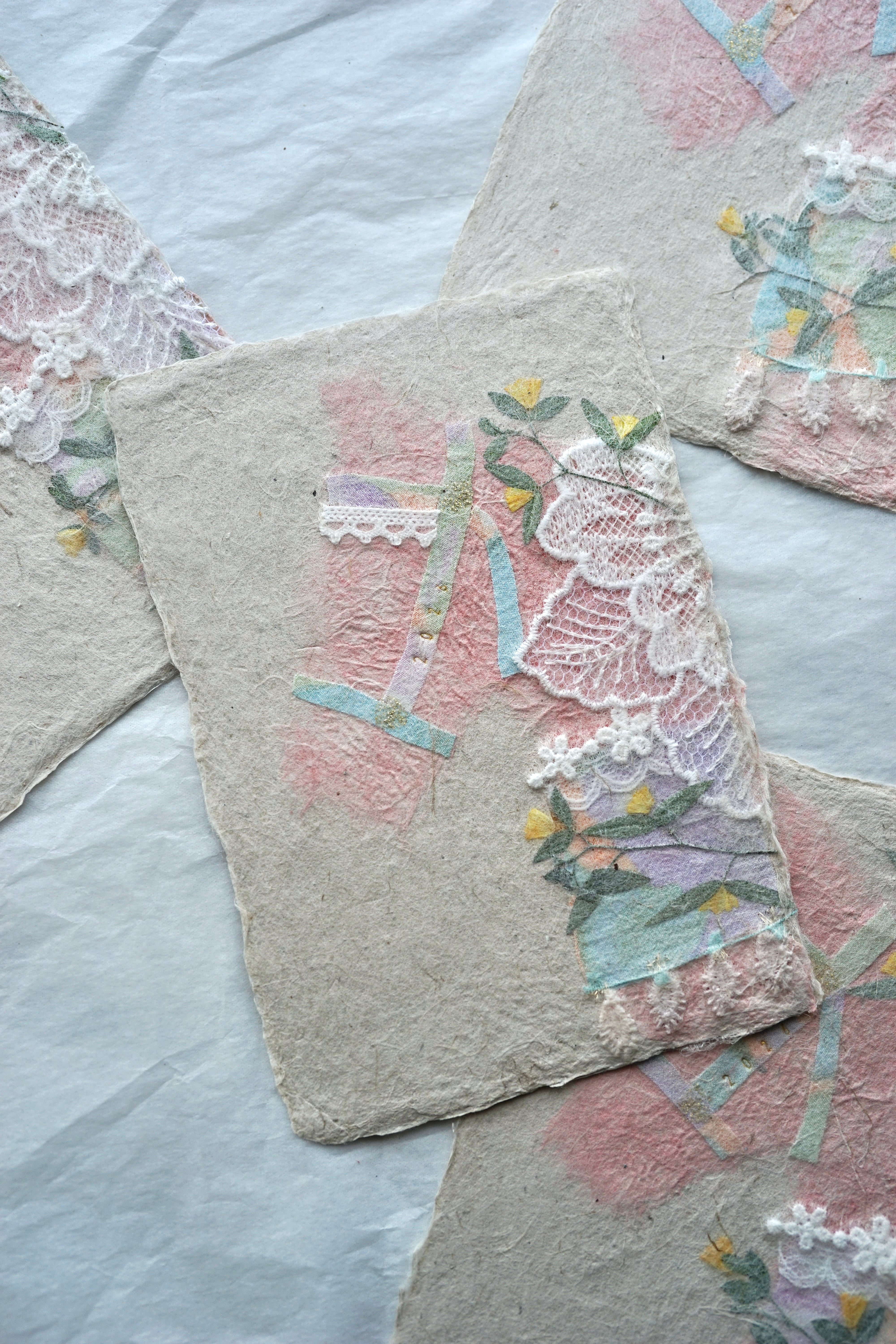 本物の布や植物を手漉き和紙の技法で漉き込んでいる為、ぽこぽことした手触りや立体感もお楽しみいただけます